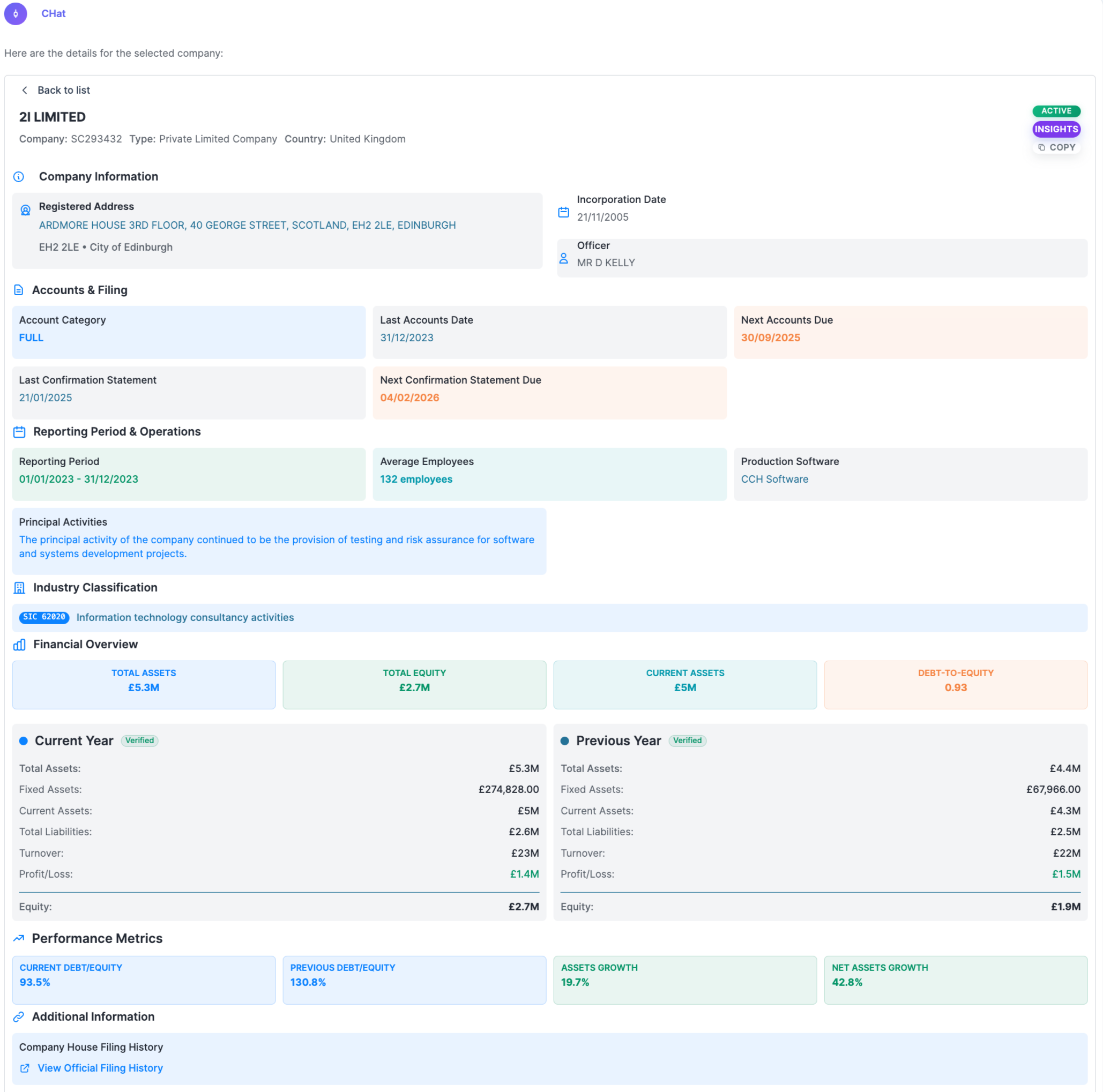 CHat is the fastest way to explore UK company financial data, detailed company profiles, and actionable insights.